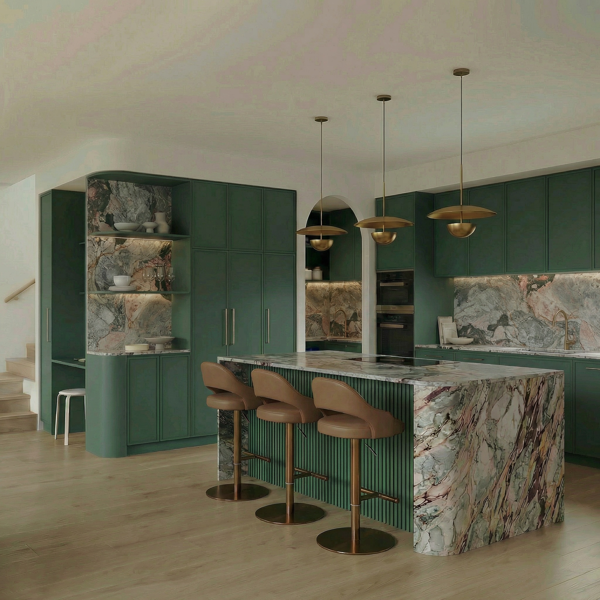 This palette is unapologetically bold. The combination of rich colour and expressive stone makes the kitchen feel dramatic and highly individual.