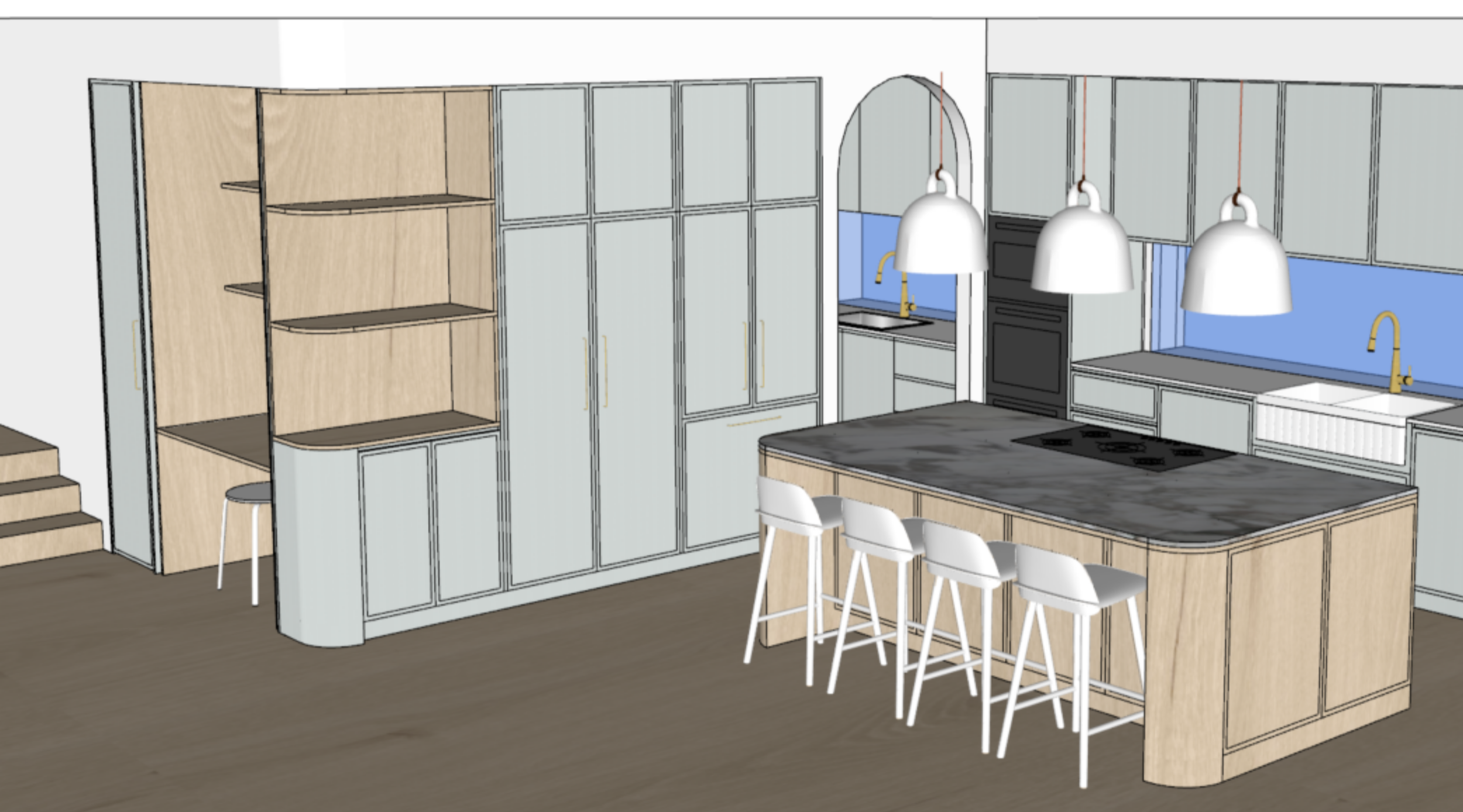 For this study, we took one of our Heliconia kitchen designs (3D model above) and applied five different palettes to create five different kitchens. The joinery, and proportions stayed constant so the effect of materiality could be seen clearly.